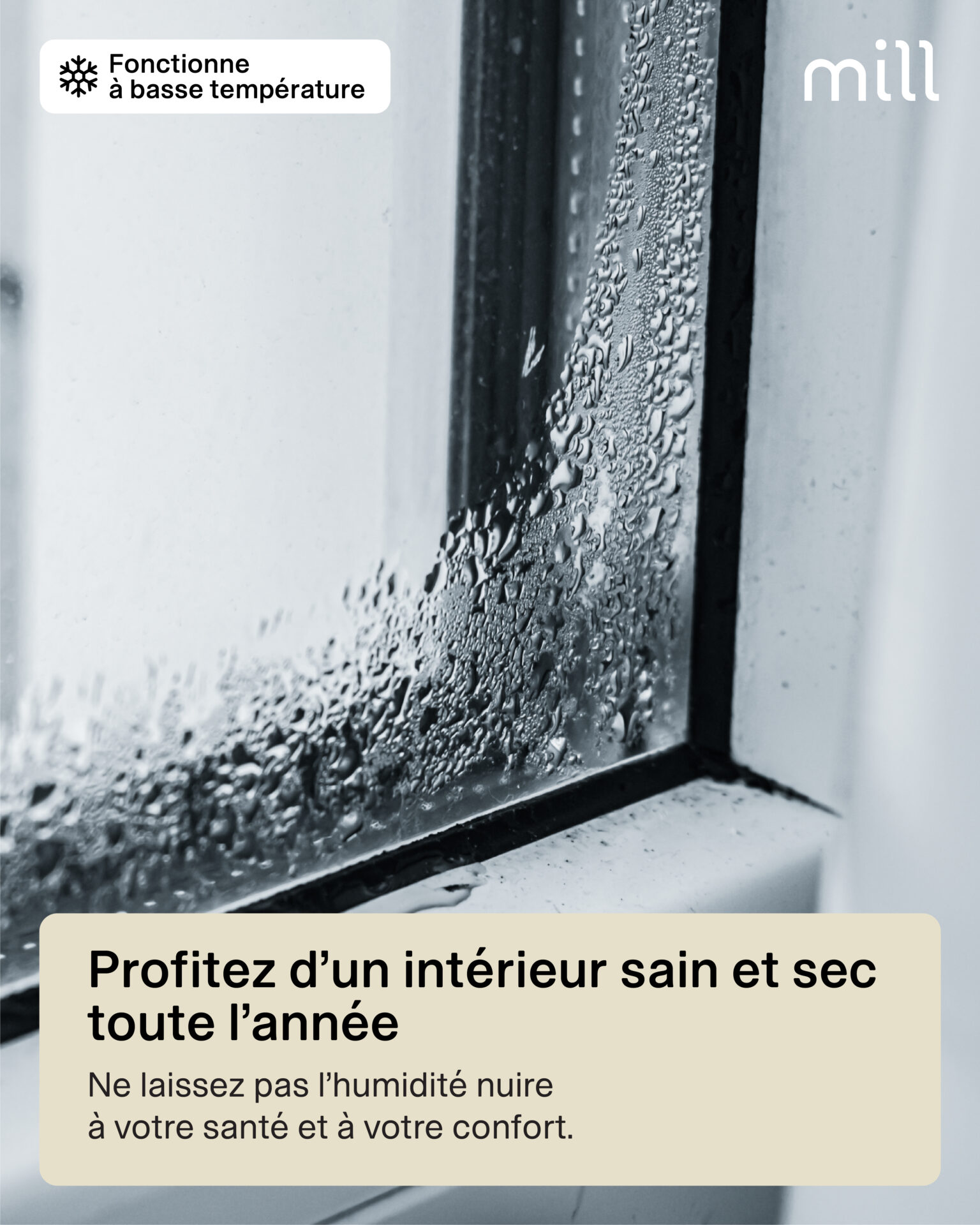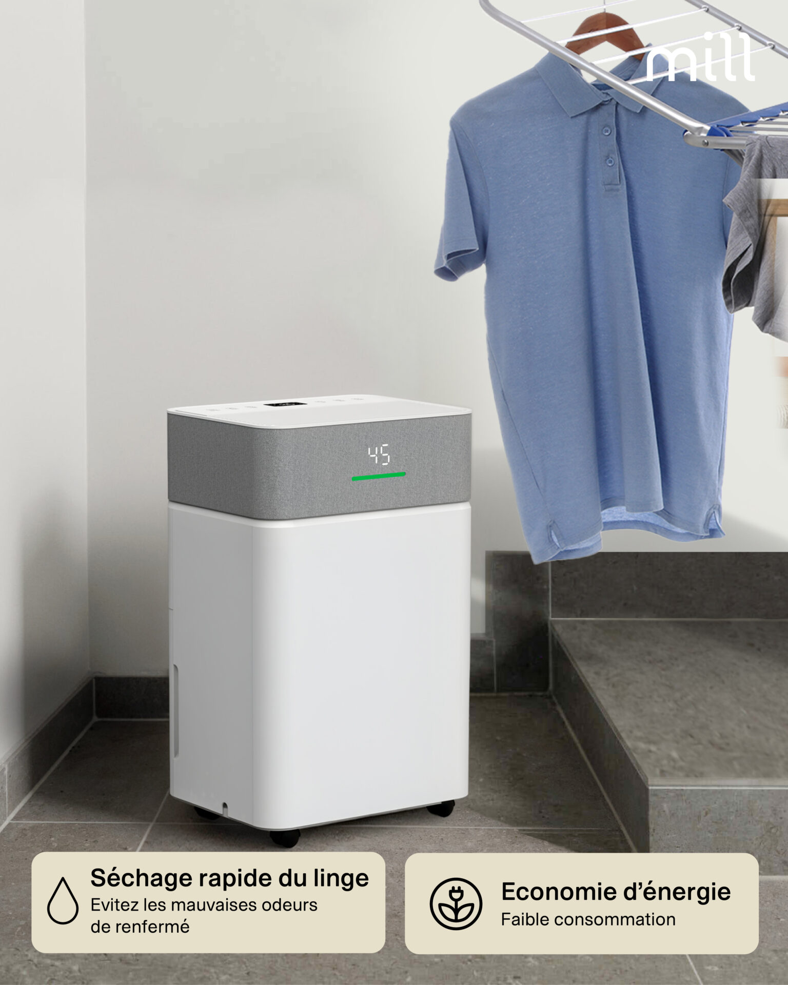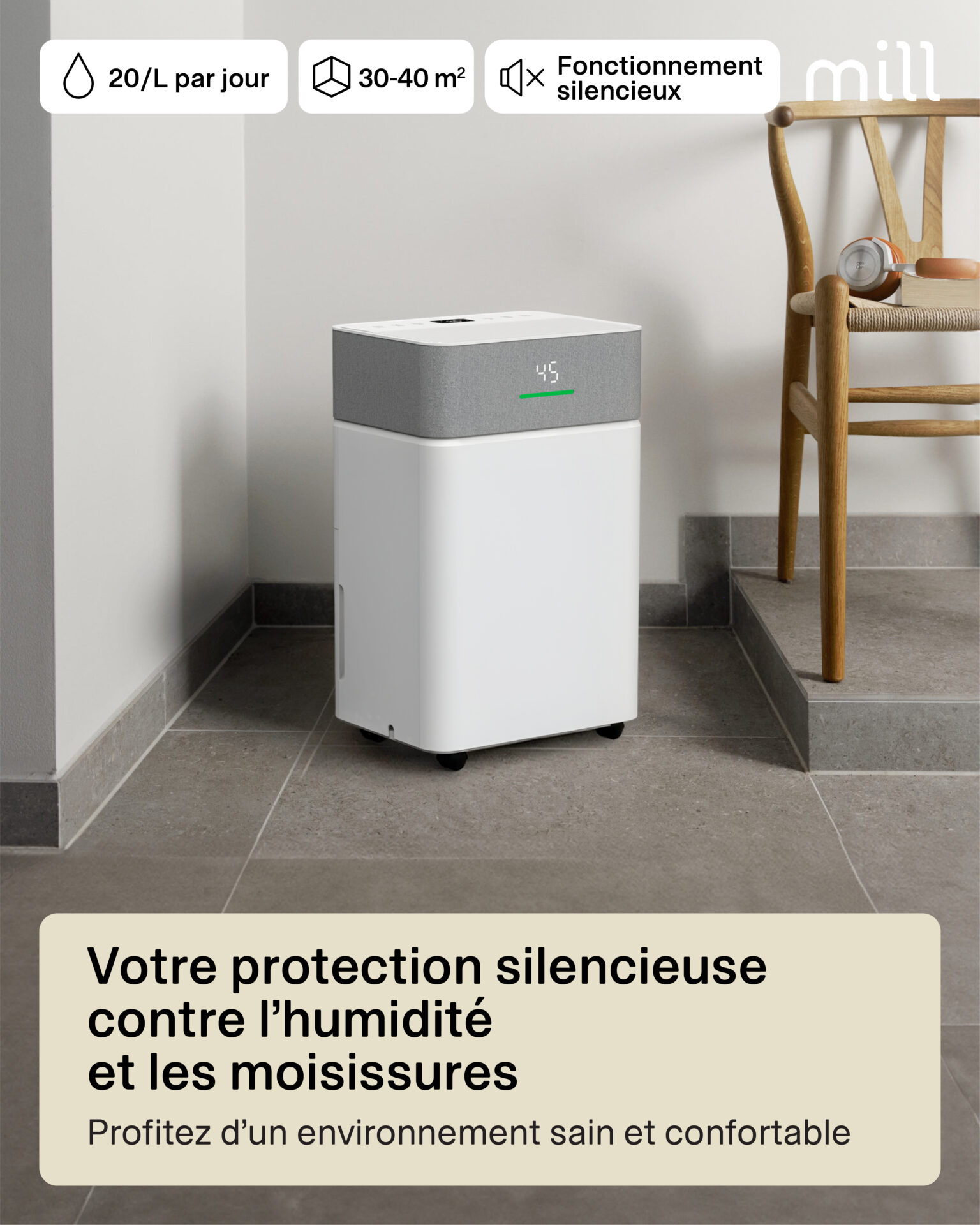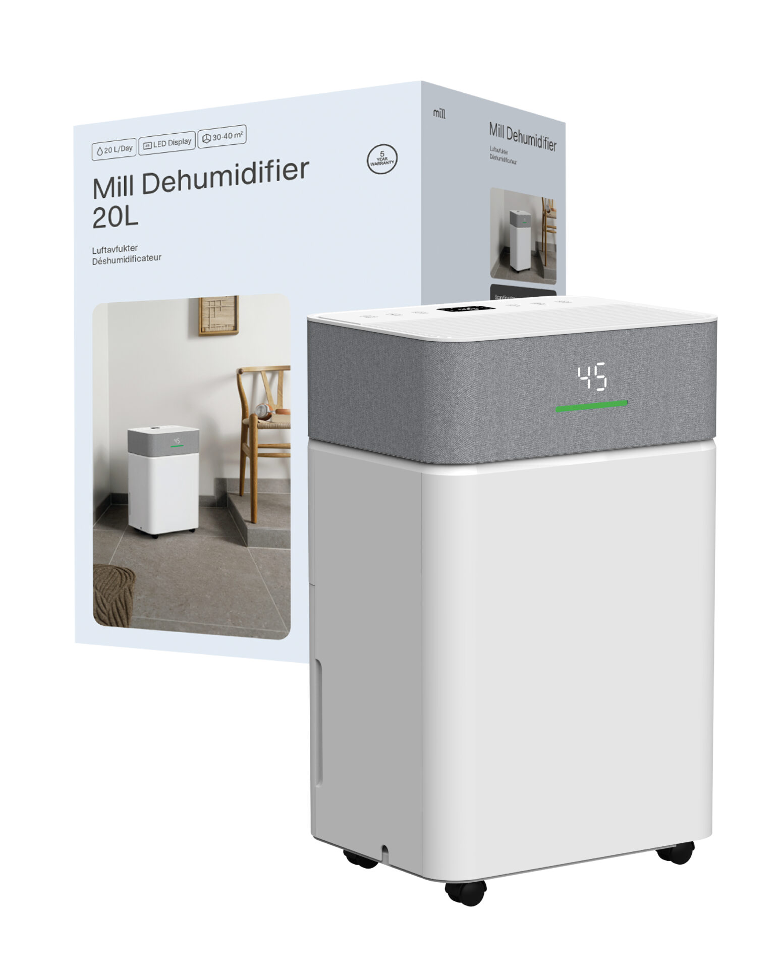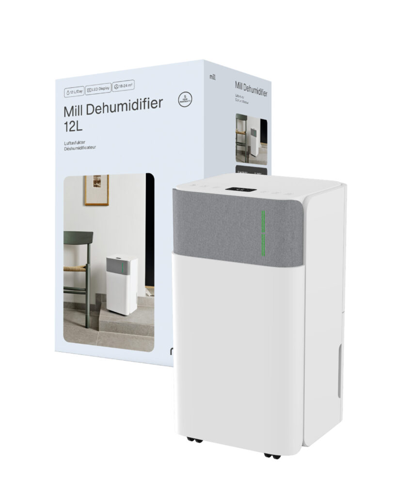 Le déshumidificateur Mill est un appareil puissant et élégant d’une capacité maximale de 20 litres par jour, qui garantit un taux d’humidité optimal dans votre maison.Il est particulièrement efficace pour sécher les vêtements ou gérer l’humidité dans les sous-sols.
