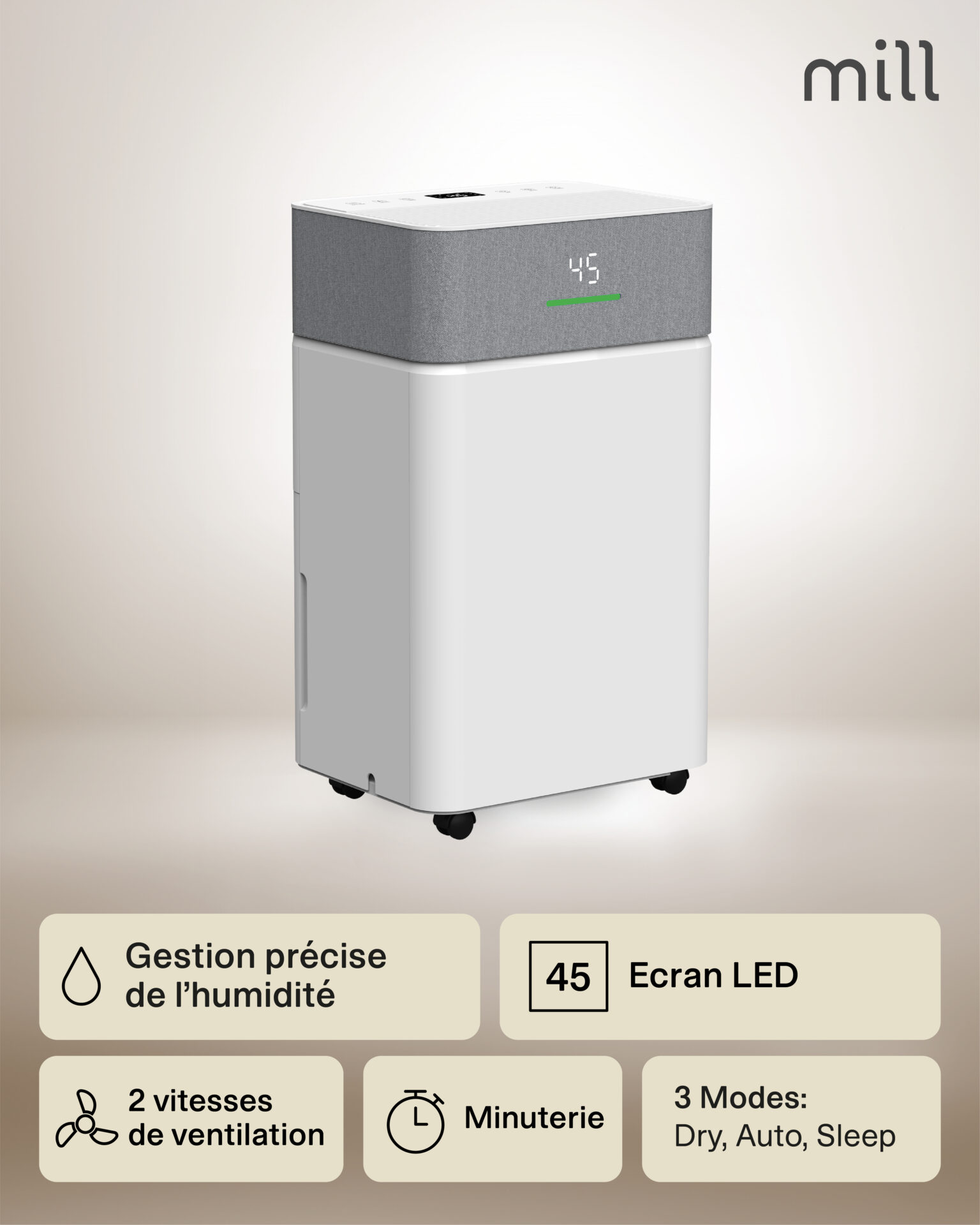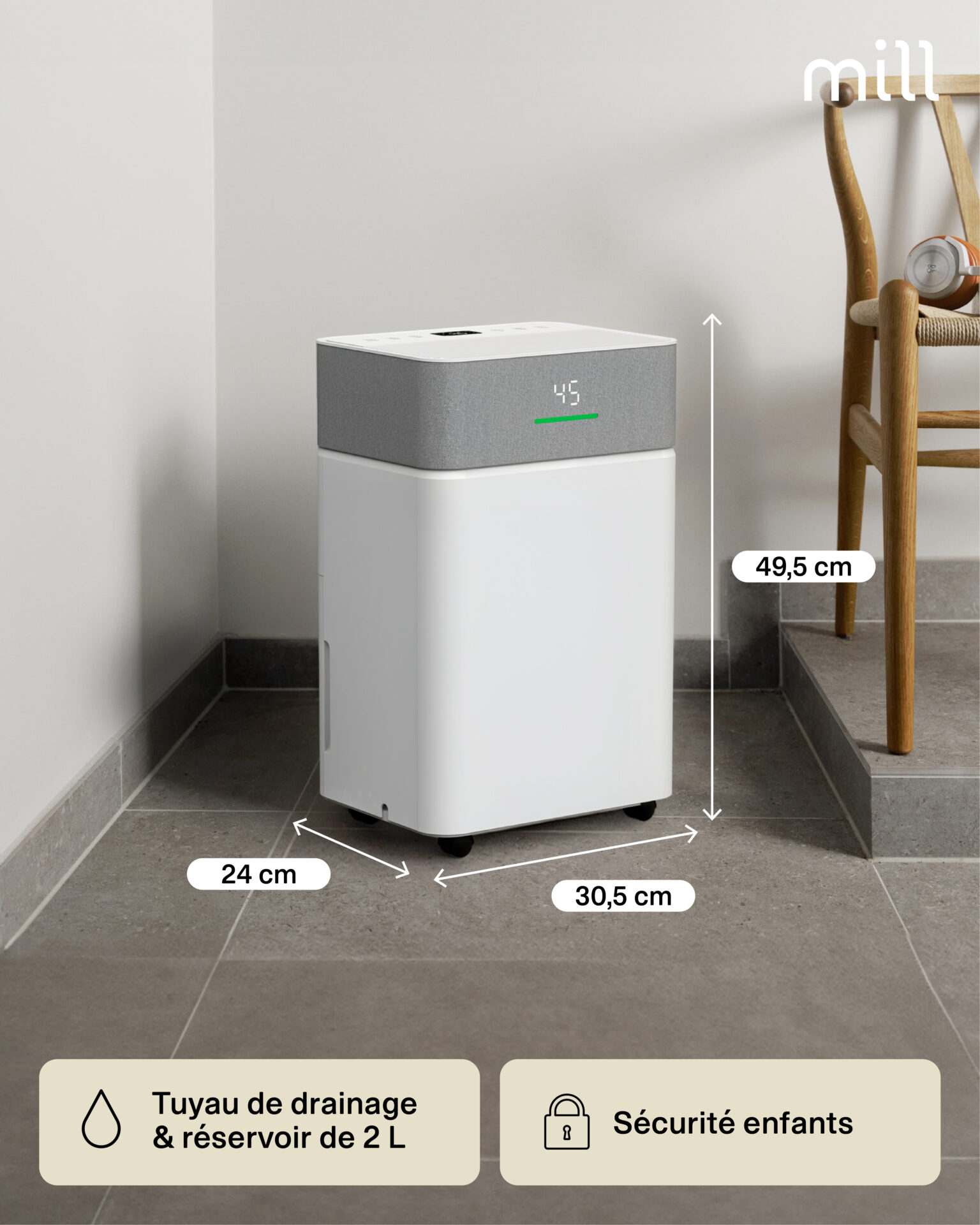 Grâce à son fonctionnement silencieux, vous pouvez maintenir un climat intérieur sain sans bruit gênant. Le déshumidificateur est facile à utiliser et vous avertit lorsque le réservoir d’eau doit être vidé. Son design minimaliste, complété par un écran LED, une fonction minuterie et une sécurité enfant, allie fonctionnalité et style. Le déshumidificateur Mill offre deux vitesses de ventilation et trois modes différents : sec, automatique et veille.